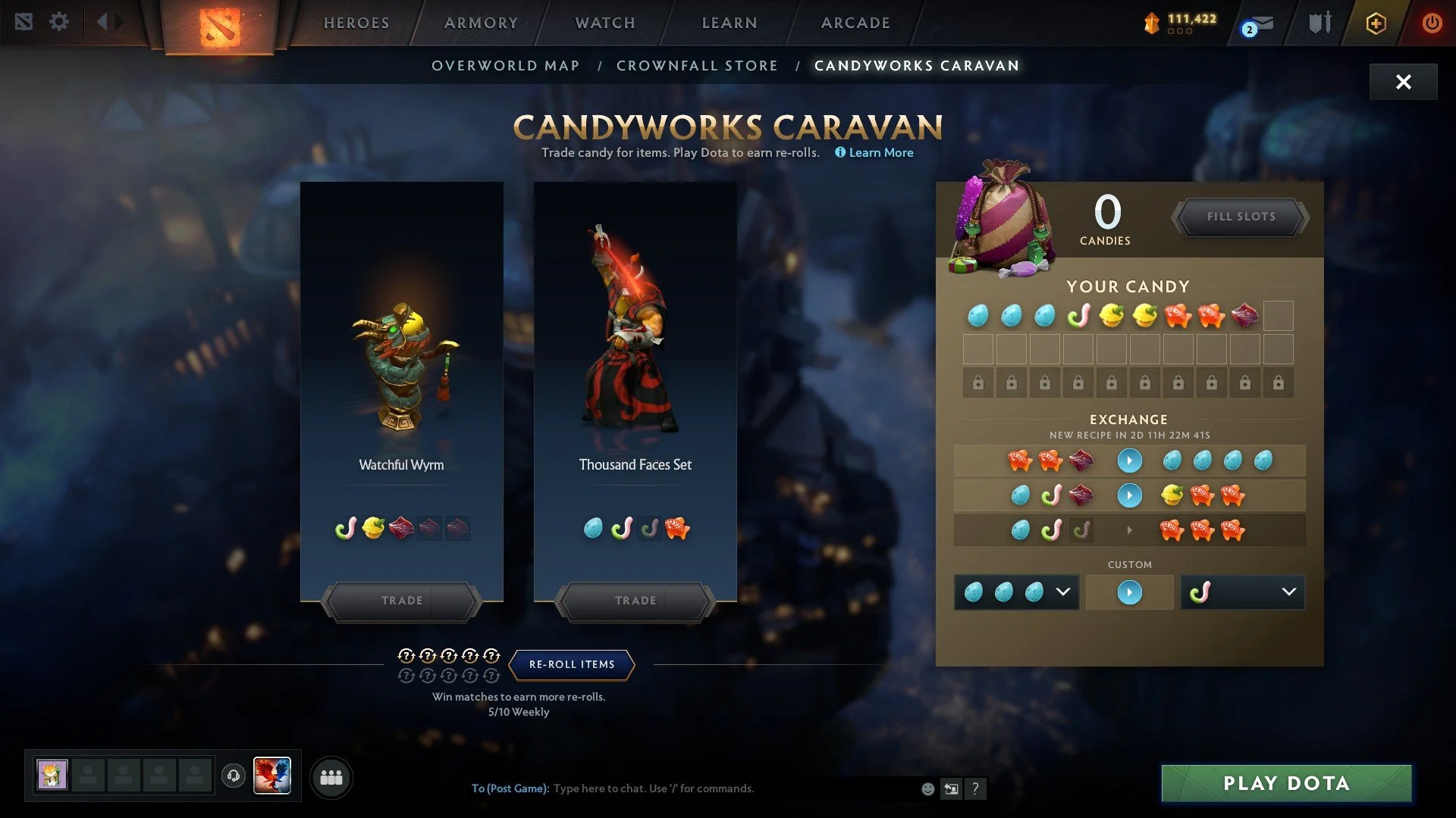 Once you complete the quest “The Market - 3” on Act, you will unlock the Candyworks Caravan which allows you to trade your candy sacks in exchange for cosmetics which includes a rare chance of containing an arcana as well. You can re-roll the choices that you have by using a reroll token, you can obtain up-to 10 rerolls per week by winning games.