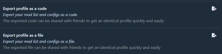 Once done then you can share that profile via a code or file, you can find that option in the settings as “export profile”. Just share that profile file or code with your friends and they can import that profile with all the mods. It can also be imported again in order to update it afterwards.